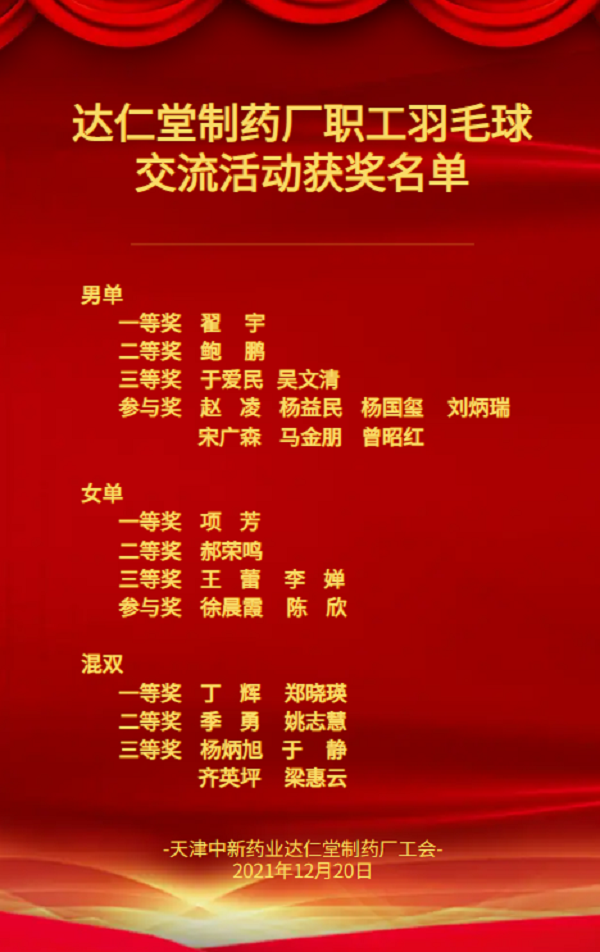 為進(jìn)一步豐富企業(yè)職工業(yè)余文化生活,搭建互動(dòng)交流平臺(tái),營(yíng)造和諧企業(yè)文化氛圍。近日,達(dá)仁堂制藥廠工會(huì)組織舉辦2021年職工羽毛球交流活動(dòng)。自通知之日起,各分會(huì)羽毛球愛(ài)好者踴躍報(bào)名,羽毛球興趣小組的成員帶頭參加活動(dòng),比賽當(dāng)日到場(chǎng)50余人。根據(jù)比賽結(jié)果統(tǒng)計(jì),一等獎(jiǎng)共計(jì)4人、二等獎(jiǎng)4人、三等獎(jiǎng)8人,參與獎(jiǎng)若干,充分展現(xiàn)了企業(yè)職工團(tuán)結(jié)拼搏、積極向上的精神風(fēng)貌。