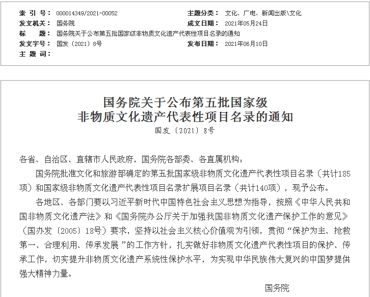 由國務(wù)院批準(zhǔn)文化和旅游部確定的第五批國家級非物質(zhì)文化遺產(chǎn)代表性項(xiàng)目名錄(共計185項(xiàng))和國家級非物質(zhì)文化遺產(chǎn)代表性項(xiàng)目名錄擴(kuò)展項(xiàng)目名錄(共計140項(xiàng))于今日正式公布。